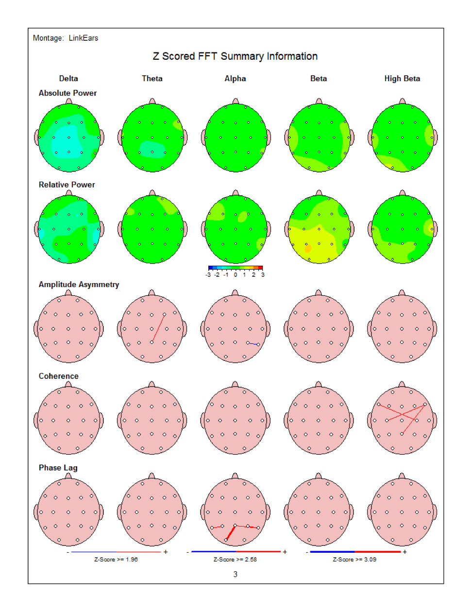 Another significant finding revealed by this Brain Map can be seen in the measures of connectivity between the different regions of the patient's brain. For example, if we look at the results of the Amplitude Asymmetry, it is evident that both blue and red lines are suffocating the frontal region of his brain. The blue lines exist in correlation with the blue hypo-activity flooding the Absolute Power measurement. In response, the other regions of the brain were attempting to compensate for the lack of activity in the frontal lobe, giving us a mess of red lines weaving in and out of the blue ones. One region wasn't reaching its optimal performance capabilities while other regions were being pushed to perform at a level at which they're not capable of doing so.